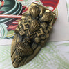 1930s round fur clip made from 4 overlapping leaf designs. Very good to excellent condition, with patina on the brass, as expected with age. Measures approximately 1.75 by 1.75 inches.