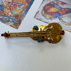 1970s good time sword brooch featuring three dangling lines of prong set stones in red, white, and blue. Matching prong set stones along the curve of the sword. Measures approximately 1 1/2 by 3 inches. Excellent condition.