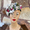 1960’s blush lampshade hat. Features ribbons wrapped around netting in a large abstract floral pattern. Blush netting falls over half the hat. Can be worn as shown off to the the side or on top of head. In excellent condition. Interior diameter measures approximately 6 1/2inches Height measures approximately 5 inches and across top measures approximately 6 inches.