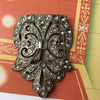 MidCentury novelty safety pin with dangling bowling ball, bowling pin and round disc (which could be engraved). Measures approximately 2 by 1.5 inches. Excellent condition.