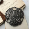 Beautiful bronze medallion brooch with intricate detail throughout. Features scalloped edge and one large turquoise-colored bead in the middle, surrounded by five smaller clear beads. C clasp. Measures 2 inches in diameter.