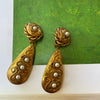 Black leather clip on earrings with gold swirl accents and jet black beads. Excellent condition. Measures approximately 1 by 2 inches.